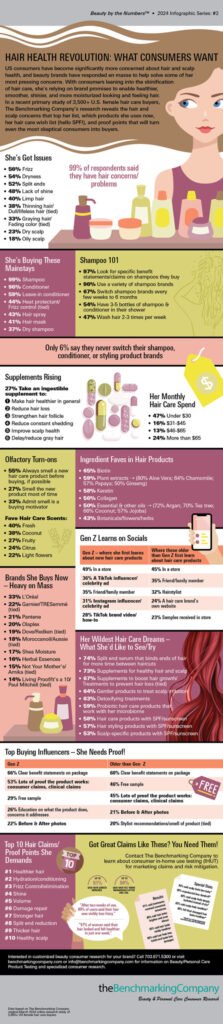 In a recent primary study of 3,500+ U.S. female hair care buyers, The Benchmarking Company’s research reveals the hair and scalp concerns that top her list, which products she uses now, her hair health wish list (hello SPF!), and proof points that will turn even the most skeptical consumers into buyers.
