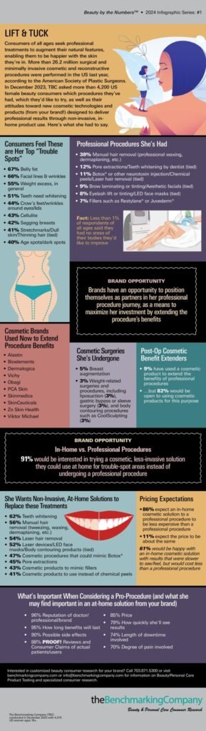Consumers of all ages seek professional treatments to augment their natural features, enabling them to be happier with the skin they’re in. More than 26.2 million surgical and minimally invasive cosmetic and reconstructive procedures were performed in the US last year, according to the American Society of Plastic Surgeons. In December 2023, TBC asked more than 4,200 US female beauty consumers which procedures they’ve had, which they’d like to try, as well as their attitudes toward new cosmetic technologies and products (from your brand!) designed to deliver professional results through non-invasive, inhome product use. Here’s what she had to say.