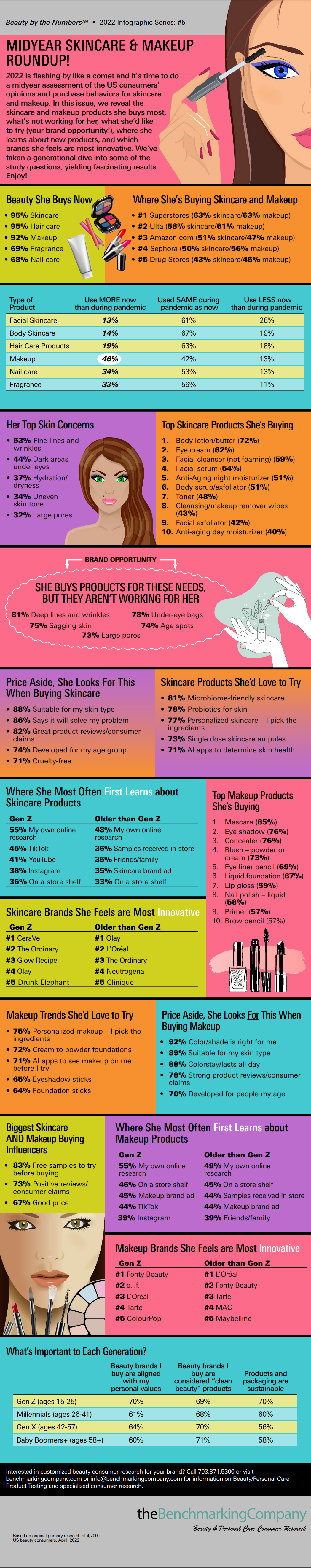 2022 is flashing by like a comet and it’s time to do a midyear assessment of the US consumers’ opinions and purchase behaviors for skincare and makeup. In this issue, we reveal the skincare and makeup products she buys most, what’s not working for her, what she’d like to try (your brand opportunity!), where she learns about new products, and which brands she feels are most innovative. We’ve taken a generational dive into some of the study questions, yielding fascinating results. Enjoy!